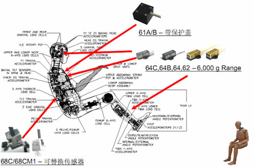 汽車碰撞測試實驗中假人身上都需要哪些加速度傳感器?假人身上的加速度傳感器的安裝位置是什么樣的?