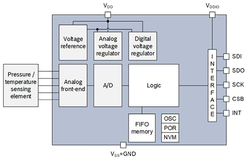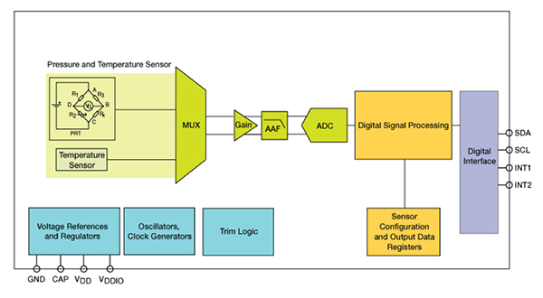 LGA 封裝帶孔,允許外部壓力到達傳感元件。該傳感器為壓阻式傳感器,包括檢測元件和一個通過 I2C 或 SPI 將檢測元件連接到應用的 IC 接口。