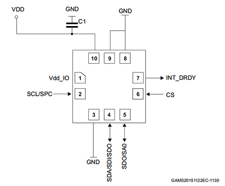 另外,使用 I2C 接口時,CS(引腳 6)必須連接到 VDD_IO(引腳 1)。