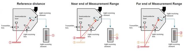 激光位移傳感器將三角測(cè)量與發(fā)射和接收透鏡配合使用。激光束通過(guò)透射透鏡射向目標(biāo)。然后,光反射回傳感器,并由接收器透鏡導(dǎo)向接收元件。隨著目標(biāo)越來(lái)越近,反射光的角度會(huì)發(fā)生變化(聚焦在接收元件上的不同位置)。位移傳感器在防止使用加速度計(jì)(例如旋轉(zhuǎn)部件)或加速度計(jì)的質(zhì)量會(huì)對(duì)系統(tǒng)運(yùn)動(dòng)產(chǎn)生太大影響的應(yīng)用中是首選。