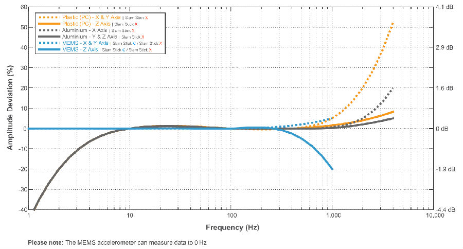 帶寬或頻率響應是加速度計選擇中最重要的參數。如果加速度計的帶寬不包括您希望測量的運動,振動或沖擊的頻率,您將無法獲得準確的結果。頻率響應規范顯示了整個頻率范圍內靈敏度的最大偏差。