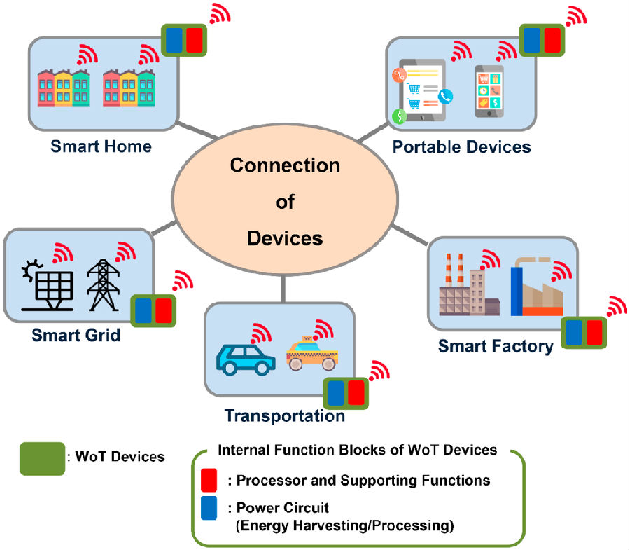 采用先進的功率處理電路的技術已用于許多應用的持續增長,例如無線傳感器網絡,的IoT裝置,和家用電器。為了實現真正的物聯網(WoT)環境,需要用于各種連接設備的可靠電源電路。如圖1所示,此類設備內部的電源電路執行能量收集和功率處理,以使這些設備可操作并連接至WoT。此類WoT設備的處理器和發射器可以利用電源電路收集和處理的能量成功運行。由于電源電路和不同類型的電源都在WOT裝置,它們的設計工程師不應忽視的功率電路(例如,能量采集接口)對系統性能的因素的影響,如可靠性,成本和效率。本文考慮的用于WoT應用的電源示例包括電池和太陽能電池。為了使不同電源有效且高效地運行,系統設計人員應考慮WoT設備中使用的電源電路的可靠電路控制策略和電源管理算法。