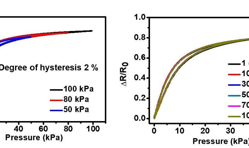 圖2.在不同壓力水平(左)和經過不同循環次數(右)后,傳感器的磁滯回線。圖片來源:韓國科學技術高等研究院(KAIST)
