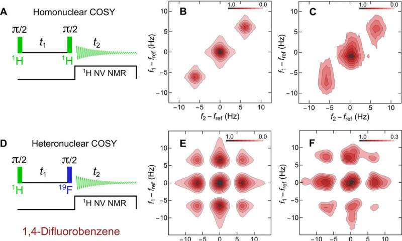 例如,科學家在研究中獲得了磷酸三甲酯(TMP)和1,4-二氟苯(DFB)化合物的特征NV NMR光譜。在建立了檢測兩種化合物亞赫茲分辨率和高信噪比(SNR)的NMR光譜的潛力之后,他們使用該平臺進行了二維COZY NMR光譜分析。為此,Smits等人。進行了2-D COZY分析的兩個變體以探測DFB(1,4-二氟苯)中的核相互作用,并使用SPINACH軟件包進行了2-D NMR的所有模擬。