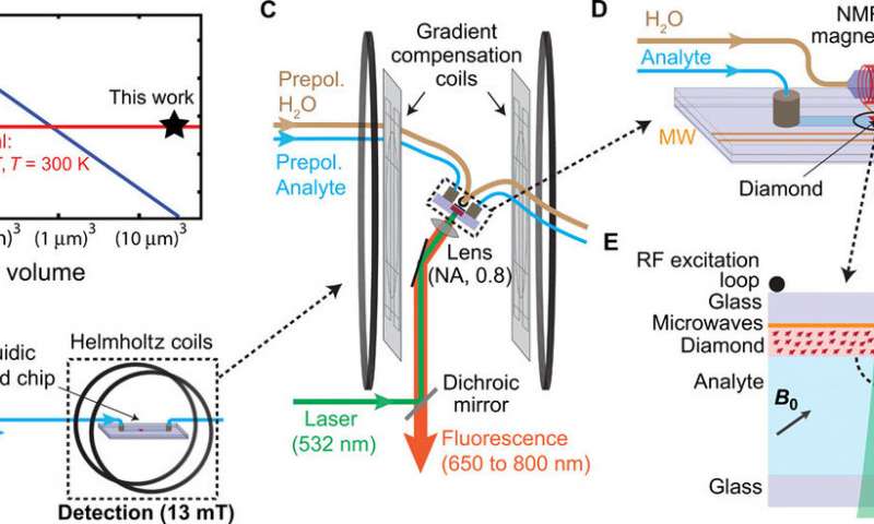 微流體預(yù)極化NMR設(shè)置。(A)比較水中質(zhì)子的統(tǒng)計極化和熱極化與檢測量的關(guān)系。室溫水質(zhì)子密度為ρ= 6.7×1028 m-3。(B)預(yù)極化概念。通過使分析物流過永磁體(1.5-T Halbach陣列)使電極預(yù)極化。隨后將其穿梭到容納在穩(wěn)定的較低磁場(B0 = 13 mT,亥姆霍茲線圈)中的微流控芯片中,并通過NV NMR對其進行檢測。(C)檢測設(shè)置。預(yù)極化的分析物流到微流體芯片,在這里它通過流體開關(guān)(未顯示)停止,并使用定制的落射熒光顯微鏡(數(shù)值孔徑(NA)約為0.8)檢測NV NMR信號。一組八個梯度補償線圈用于消除沿磁場方向的一階和二階磁場梯度。使用基于線圈的NMR磁力計和纏繞在主亥姆霍茲線圈上的低電感反饋線圈,可以暫時穩(wěn)定磁場。(D)微流體芯片設(shè)置。該芯片是使用玻璃和粘合劑構(gòu)建的。兩條流體管線通向檢測區(qū)域,一條流體由水組成(用于NMR線圈磁力計),另一條流體與分析物組成(用于NV NMR)。放置在NMR線圈磁力計和NV NMR傳感器之間的射頻(RF)激勵回路可激發(fā)兩個通道中的核自旋相干。NMR線圈磁力計由3毫米直徑的線圈組成,該線圈纏繞在約10微升的水量中。將射頻激勵回路和NMR線圈磁力計彼此正交放置,以最大程度地減少串擾。印刷在玻璃芯片內(nèi)部的銅微波(MW)線可對NV電子自旋進行自旋控制。(E)NV NMR幾何形狀。NV摻雜的金剛石膜(1毫米乘1毫米乘0.035毫米)位于與分析物接觸的微流體通道(寬度:2毫米,高度:0.2毫米至1毫米)的表面上。激光照射(532 nm)從印刷的微波線上反射,并檢測到熒光(650至800 nm)。有效的分析物檢測量約為40 pL。圖片來源:Science Advances,doi:10.1126 / sciadv.aaw7895 NV摻雜的金剛石膜(1毫米乘1毫米乘0.035毫米)位于與分析物接觸的微流體通道(寬度:2毫米,高度:0.2毫米至1毫米)的表面上。激光照射(532 nm)從印刷的微波線上反射,并檢測到熒光(650至800 nm)。有效的分析物檢測量約為40 pL。圖片來源:Science Advances,doi:10.1126 / sciadv.aaw7895 NV摻雜的金剛石膜(1毫米乘1毫米乘0.035毫米)位于與分析物接觸的微流體通道(寬度:2毫米,高度:0.2毫米至1毫米)的表面上。激光照射(532 nm)從印刷的微波線上反射,并檢測到熒光(650至800 nm)。有效的分析物檢測量約為40 pL。圖片來源:Science Advances,doi:10.1126 / sciadv.aaw7895