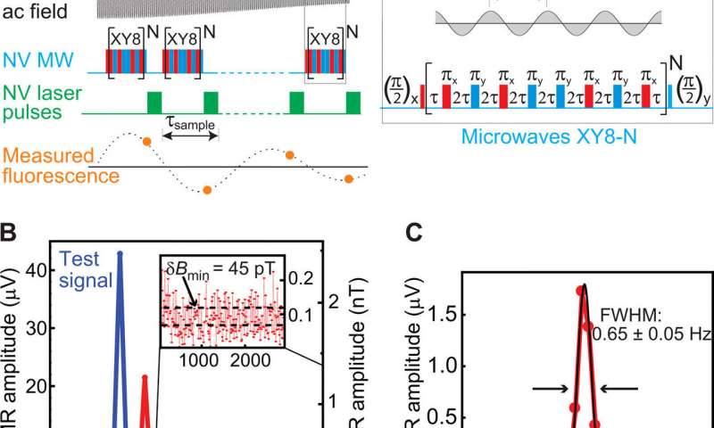 預(yù)極化的NV NMR的表征。(A)同步讀出脈沖序列。它由一系列XY8-N脈沖組成,這些脈沖對由處理核產(chǎn)生的交流磁場進行連續(xù)的相位測量。測得的熒光反映了核交流場投影的混疊形式。每2.5到4.25 s(流動1.25 s,其余用于檢測)重復(fù)整個序列。(B)水(紅色)和施加的2.5nT振幅測試場(藍色)的NV NMR光譜(傅里葉變換的絕對值),有效采集時間為5.2 s(平均60條跡線;總測量時間為150 s) )。從處理后的光電探測器信號獲得的NMR信號幅度以μV記錄。磁場幅度的轉(zhuǎn)換(以nT為單位)是從校準的測試場得出的。插圖:本底噪聲的SD顯示aBmin = 45 pT。根據(jù)這些數(shù)據(jù),我們推斷出最低可檢測濃度為27 M s1 / 2(SNR = 3)。加上所有的實驗死區(qū)時間,濃度靈敏度約為45 M s1 / 2。(C)水的高分辨率NV NMR光譜(傅里葉變換的虛部)顯示半峰全寬(FWHM)的線寬為0.65±0.05 Hz。通過平均60條跡線(每條3 s長)獲得數(shù)據(jù)。圖片來源:Science Advances,doi:10.1126 / sciadv.aaw7895 65±0.05赫茲。通過平均60條跡線(每條3 s長)獲得數(shù)據(jù)。圖片來源:Science Advances,doi:10.1126 / sciadv.aaw7895 65±0.05赫茲。通過平均60條跡線(每條3 s長)獲得數(shù)據(jù)。圖片來源:Science Advances,doi:10.1126 / sciadv.aaw7895