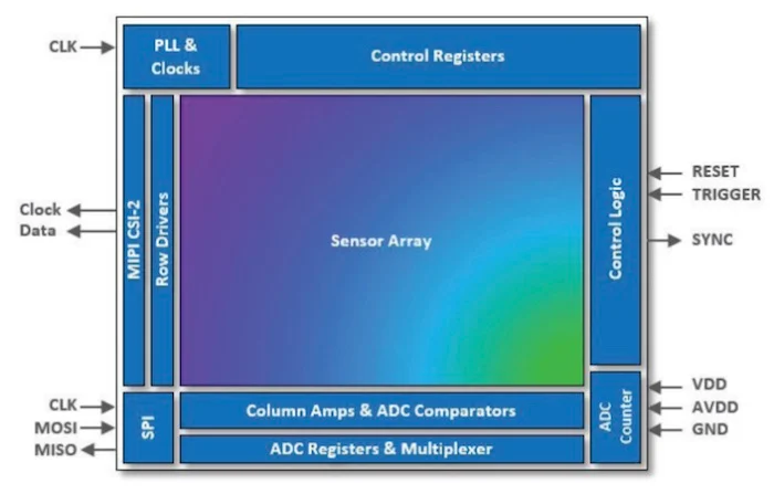 該接口包含一個 4 通道MIPI CSI-2輸出接口,以 1.5 Gbps/通道運行,以及一個 SPI 40 MHz 控制接口。Hawkeye 在 120 fps 下使用低于 750 mW,工作溫度范圍為 -40 ℃ 至 +85 ℃(否則稱為工業應用)。