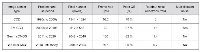然而,從 2011 年開始,新一代 sCMOS 將 QE 提高了 72% - 82%,并將讀取噪聲降低到 sCMOS 在許多應用中超過 CCD 的程度。新的技術,即所謂的第三代 sCMOS,使 CCD/EM-CCD 圖像傳感器的能力完全相形見絀。