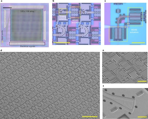 由此產生的設備在 1 平方厘米的固態芯片上創建了 128x128 像素陣列。研究人員聲稱,該芯片上的 16,348 像素遠遠超過了之前達到的數量,使其成為市場上分辨率的固態 FPSA 芯片。