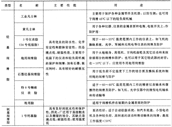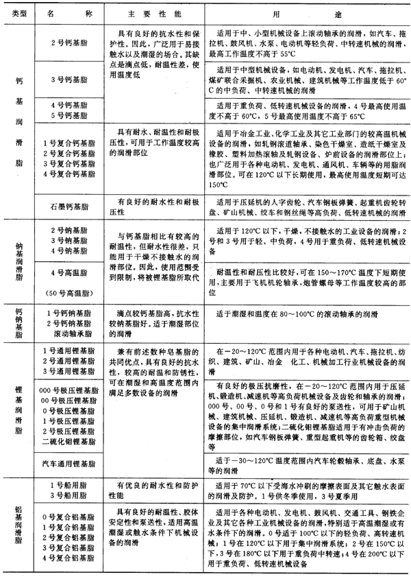 礦油類潤滑脂品種較多,目前廣泛使用的主要品種、性能及用途見表10。其中,鋰基潤滑脂幾乎兼備其它皂基脂的優點,在多數場合下都可取代其它皂基脂,是國內推廣應用的新品種。