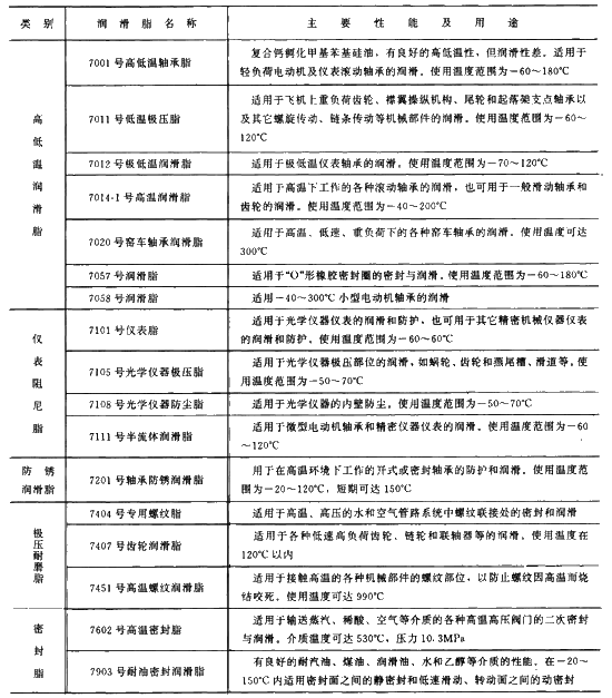 合成油經稠化而成的潤滑脂統稱合成(油)潤滑脂,均系特殊性能的潤滑脂。表11為幾種合成脂的性能及主要用途。