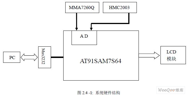 本系統(tǒng)的硬件結(jié)構(gòu)如圖2.4 -1 所示。 由于At91sam7s64 具有片上A/D 轉(zhuǎn)換器而且具有8 選1 模擬復(fù)用器,使得MMA7620Q 和HMC2003 可以直接與微控制器相連而不必外加A/D 轉(zhuǎn)換器和復(fù)用器,不僅降低了系統(tǒng)的 成本和體積,提高了系統(tǒng)的集成度,同時(shí)減少了誤差源,提高了精度。經(jīng)過(guò)A/D 轉(zhuǎn)換的測(cè)量數(shù)據(jù)經(jīng)過(guò)ARM 核的處理后,被送到串口LCD 并通過(guò)RS232 接口送入PC 機(jī)進(jìn)行進(jìn)一步 的分析。