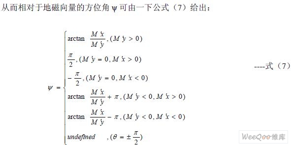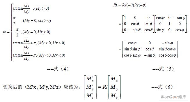 為了獲得系統(tǒng)相對(duì)于當(dāng)?shù)氐卮畔蛄康姆轿唤牵枰褂肕R 傳感器的三個(gè)輸出Mx, My, Mz 。當(dāng)系統(tǒng)置于水平狀態(tài)時(shí)(俯仰角和橫滾角都為0)時(shí),方位角ψ 可以由公式(4)直 接給出,但是在大多數(shù)情況下,系統(tǒng)并不是工作在水平狀態(tài),此時(shí)地磁場(chǎng)的豎直分量將會(huì)影 響Mx 和My 的值,因此不能直接由公式(4)獲得相對(duì)于地磁向量的方位角。為了在所有 情況下都能獲得正確的方位角,必須將俯仰角和橫滾角考慮在內(nèi),即必須通過(guò)以俯仰角和橫 滾角為參數(shù)的坐標(biāo)變換,將測(cè)得的(Mx, My, Mz)向量變換為與載體坐標(biāo)系有相同方位角的 水平坐標(biāo)系下的向量(M’x , M’y, M’z),其變換矩陣如公式(5)。