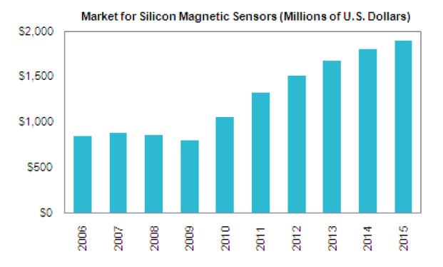 磁傳感器進入了加速發展的時代。度過了2009的低潮,到了2010基于硅的磁傳感器有了快速的增長,覆蓋了各個領域,特別是在汽車和消費市場領域。從2009年到2010年數量增加了38%。預期這個市場在2015年將會達到19億美金,比2010年的11億美金,復合增長率為12%。