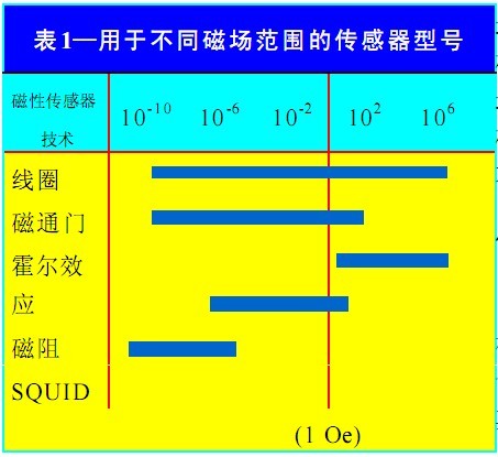 磁場測量可分為三個范圍。在每個范圍中,能在其環境中處于最佳工作狀態的磁性傳感器型號也不同。第一個磁場范圍遠大于地球磁場(如在永久磁鐵或大電流附近)。其范圍為 100 奧斯特(Oe) 或更高。第二個磁場范圍約等于地球磁場或0.6 Oe 。第三個磁場范圍遠遠小于地球磁場,它們在 1 mOe 或更低范圍內。地球磁場常用作受鐵磁物體干擾的背景磁場,如在磁異態檢測中的鐵磁物體。表 1 給出了用于不同磁場范圍的傳感器型號 。