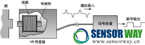 ---- 當靶的凸出部分(例如齒輪的輪齒)運動接近到傳感器,此時磁通量最大。當靶的凸出部分離去,磁通量跌落。靶的運動結果引起磁通量隨時間變化,這在線圈中感應出成比例的電壓,以后的電路(信號處理電路)將輸入信號變成數字波形(脈沖),它能更容易計數及時間控制。