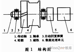 基于磁敏角度技術的拉線式位移傳感器的功能是將拉線的機械位移換成可以計量、記錄或傳送的電信號,主要由自動回復彈簧、輪轂、磁鐵以及數據處理單元等部分構成,結構如圖1所示。