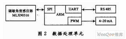 數據處理單元由磁敏角度感應器、微處理器單元、通信接口以及輸出模塊,具體的功能框如圖2所示。