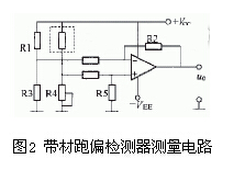 圖2為測量電路簡圖。R1、R2是同型號的光敏電阻。R1作為測量元件裝在帶材下方,R2用遮光罩罩住,起溫度補償作用。當帶材處于正確位置( 中間位)時,由R1、R2、R3、R4組成的電橋平衡,使放大器輸出電壓U0為0。當帶材左偏時,遮光面積減少,光敏電阻R1阻值減少,電橋失去平衡。差動放大器將這一不平衡電壓加以放大,輸出電壓為負值,它反映了帶材跑偏的方向及大小。反之,當帶材右偏時,U0為正值。輸出信號U0一方面由顯示器顯示出來,另一方面被送到執行機構,為糾偏控制系統提供糾偏信號。