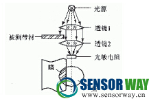 光電式帶材跑偏檢測器原理如圖1所示。光源發出的光線經過透鏡1會聚為行光束,投向透鏡2,隨后被會聚到光敏電阻上。在平行光束到達透鏡2的途中,有部分光線受到被測帶材的遮擋,使傳到光敏電阻的光通量減少。