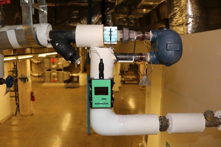 Everactive傳感器的關鍵是其超低功耗集成電路,該集成電路從室內光和振動等來源收集能量以生成數據。圖中為監控泵的傳感器。信用:圖片由Everactive提供