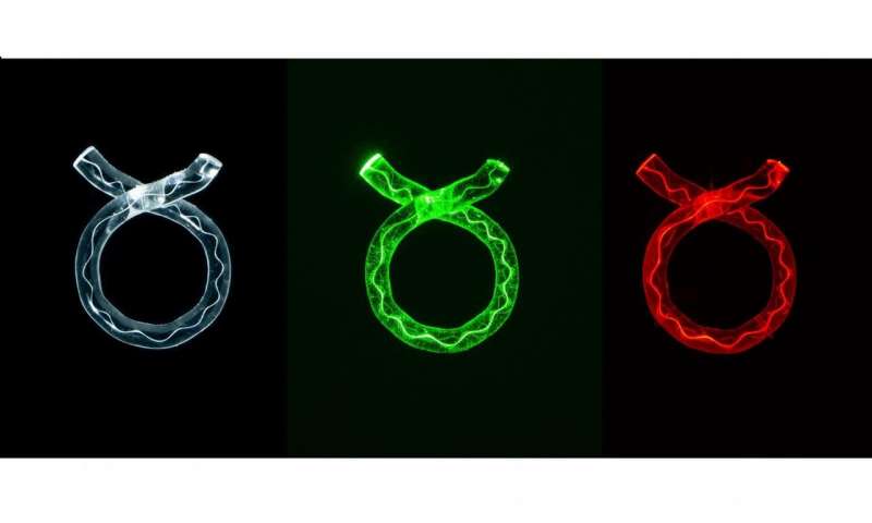 藝術(shù)家凱倫·坎寧安(Karen Cunningham)的三只玻璃戒指。彩色的光線揭示了藝術(shù)品中使用的鉆石的內(nèi)部線條。圖片來源:Michael Haines Photography