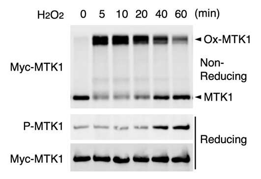 氧化應(yīng)激誘導(dǎo)的MTK1活化需要MTK1的氧化和還原。將細(xì)胞用H2O2處理指定的時間。細(xì)胞提取物在非還原條件下進(jìn)行電泳,并用抗Myc抗體進(jìn)行免疫印跡(上圖)。免疫沉淀的Myc-MTK1在還原條件下進(jìn)行電泳,并用抗P-MTK1或抗Myc抗體(中間和底部)進(jìn)行探測。圖片來源:東京大學(xué)醫(yī)學(xué)科學(xué)研究所