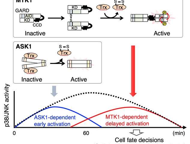 一個研究小組在醫(yī)學(xué)科學(xué)的東京日本大學(xué)研究院,由Mutsuhiro Takekawa教授為首,已發(fā)現(xiàn)一種新的機(jī)制,是引起通過檢測細(xì)胞反應(yīng)的氧化應(yīng)激在人體內(nèi)。MTK1 SAPKKK被認(rèn)為是一種新型的人類氧化應(yīng)激傳感器,可以感應(yīng)體內(nèi)過量的活性氧并將該信息傳遞給細(xì)胞,從而導(dǎo)致細(xì)胞死亡和炎性細(xì)胞因子的產(chǎn)生。這項(xiàng)研究的結(jié)果發(fā)表在2020年6月24日的《科學(xué)進(jìn)展》上。