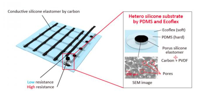 在發(fā)表的論文中,研究人員描述了使用兩種不同的材料(一種軟材料和一種硬材料)來保護(hù)傳感器伸展和準(zhǔn)確測量運(yùn)動的能力。將硬硅樹脂(PDMS)沿著電極放置在陣列上方,并且在每個(gè)放置的核心處,他們都放置了可感知壓力的柔軟的多孔硅樹脂。