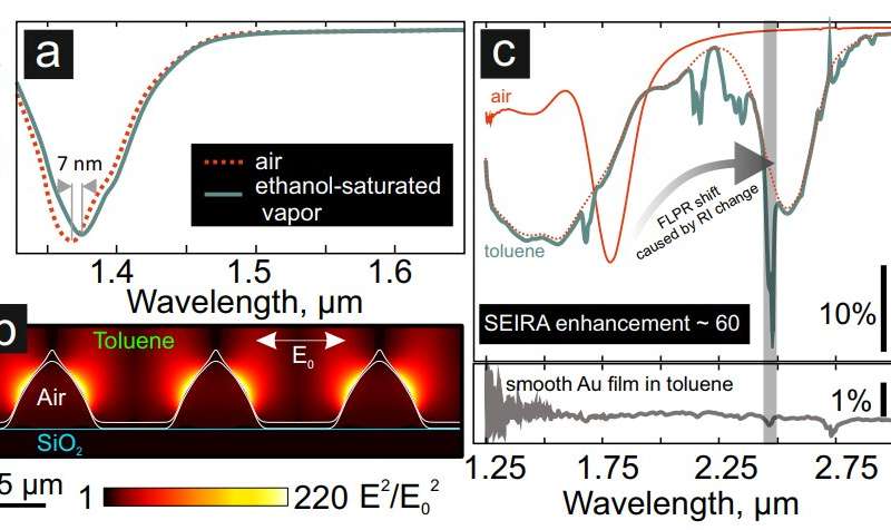 一階晶格等離子體共振(FLPR)的各種應用a)由注入飽和乙醇蒸氣引起的納米空隙陣列SP傳感器的光譜響應。(b)在2.5μm波長的線性極化光源從頂部激發納米空隙陣列的表面附近時,計算出的平方化歸一化EM場振幅E2 / E2 0靠近甲苯。(c)在空氣中和在甲苯液體層下的納米空隙陣列的FTIR反射光譜。如果不吸收甲苯,則虛線表示納米空隙陣列對反射光譜的貢獻。底部面板顯示了在相同條件下從被甲苯覆蓋的光滑Au膜表面反射的FTIR反射。