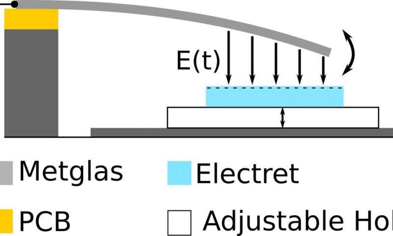 通過(guò)施加磁場(chǎng),彎曲梁振動(dòng)。永久充電的駐極體(藍(lán)色)拉動(dòng)彎曲梁。這樣,他的振動(dòng)力變得更強(qiáng),并且發(fā)出的電信號(hào)也更強(qiáng)。學(xué)分:基爾大學(xué)