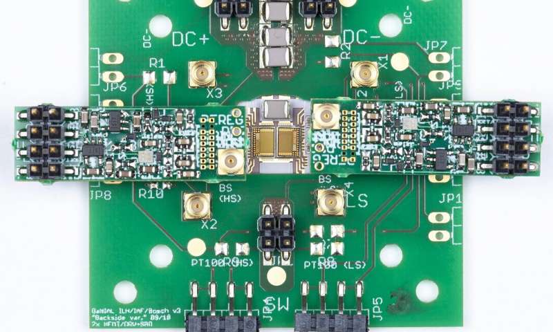 在電動(dòng)汽車中,需要在有限的空間內(nèi)集成許多小型高效的系統(tǒng)。所示的電壓轉(zhuǎn)換器基于尺寸為4 x 3mm2的GaN電源IC。圖片來源:Fraunhofer IAF