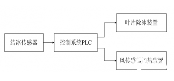 結冰傳感器安裝在機艙頂部,將結冰厚度信息轉換成電壓或電流信號,傳送給風機主控系統PLC。PLC根據預先設定的冰層厚度閥值控制除冰裝置的起停。利用機組主控系統PLC預留的IO接口即可實現結冰厚度的采集和除冰裝置的控制,降低系統成本。