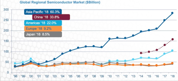 折線圖顯示了全球區域半導體市場的趨勢。在這里,您可以看到美國的領先地位是在2000年。圖片由SIA提供
