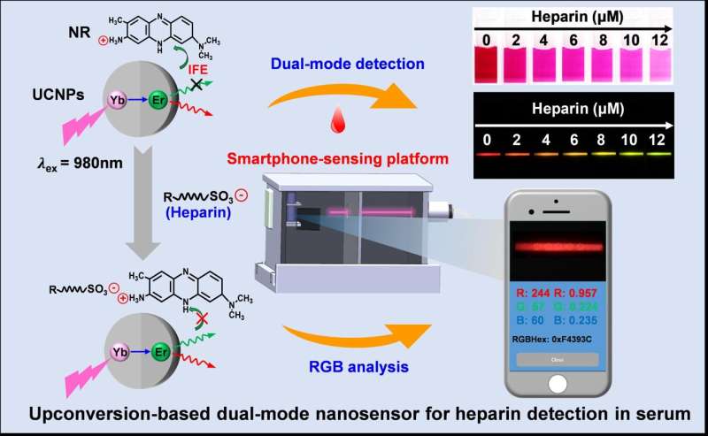 這種新型肝素傳感器解決了傳統熒光方法中自發熒光和光漂白的常見問題。它表現出熒光-比色雙響應光學行為,熒光模式下的檢測限為 0.1 nM,比色模式下的檢測限為 0.3 nM。
