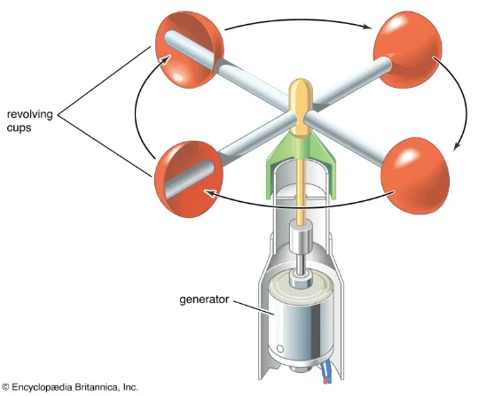 轉杯式電子風速計示意圖。圖片由大英百科全書提供