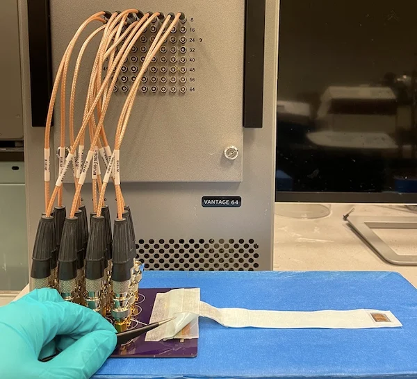 超聲波可穿戴設備連接到其完整的實驗裝置。圖片由UCSD提供