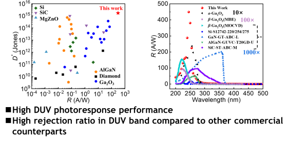 圖2.該工作與其他已報道的深紫外探測器性能對比
