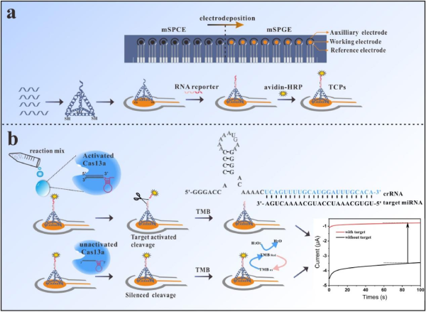近日,中國科學(xué)院上海微系統(tǒng)與信息技術(shù)研究所研究員宓現(xiàn)強(qiáng)課題組構(gòu)建了一種基于CRISPR的電化學(xué)傳感器(CRISPR-E)。該研究將DNA四面體框架結(jié)構(gòu)修飾在印刷電極上,進(jìn)一步與RNA探針雜交,最后連接HRP分子構(gòu)建TCP探針;通過將電化學(xué)技術(shù)、DNA四面體框架結(jié)構(gòu)與CRISPR技術(shù)相結(jié)合,利用Cas 13a在crRNA的引導(dǎo)下識別靶RNA后能夠?qū)捂淩NA表現(xiàn)出“附帶切割”能力,實(shí)現(xiàn)了對miRNA的無擴(kuò)增、高靈敏度檢測。由于整個(gè)反應(yīng)過程可以在電極上實(shí)現(xiàn),因此有望推動(dòng)miRNA的及時(shí)快速(POC)檢測。