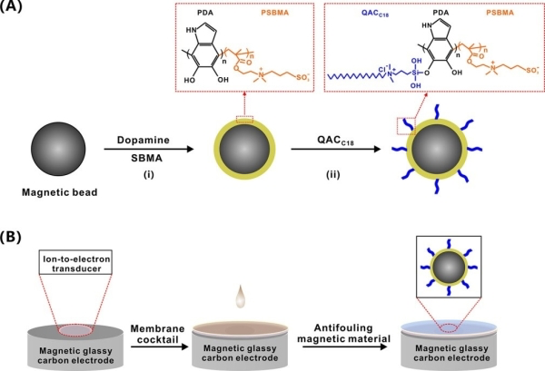 圖4.磁性雙功能納米材料的合成(A)及可更新式防污損傳感器的構(gòu)建(B)示意圖
