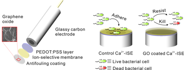 圖3.基于氧化石墨烯的聚合物敏感膜電位型傳感器的構(gòu)建和防污原理示意圖