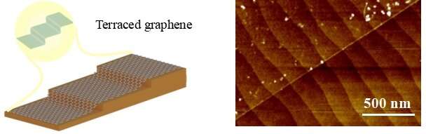 圖顯示(左)梯狀單層石墨烯形成的概念。這類(lèi)似于亞洲廣泛用于農(nóng)業(yè)的梯田。(右)鈦酸鍶(STO,左上)和裸 STO 基板(右下)上石墨烯梯狀形態(tài)的原子力顯微鏡圖像。學(xué)分:先進(jìn)材料