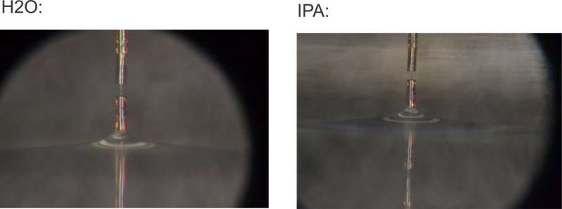 研究人員使用新傳感器通過測量從水(左)和異丙醇(右)中取出微型圓柱體時的回縮力來測量液體的表面張力。圖片來源:馬里博爾大學(xué) Denis Donlagic