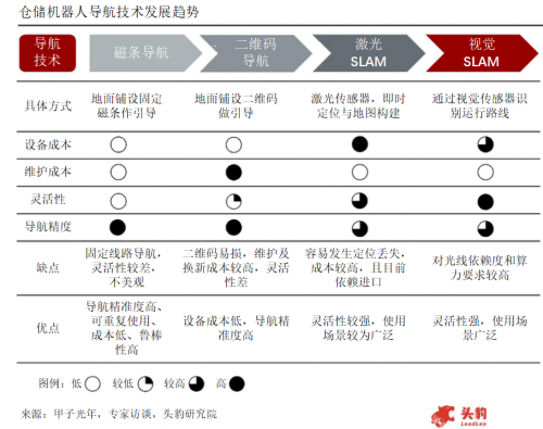 磁條導航與二維碼導航,具有維護成本高,路線固定導致靈活性相對較差的特點。視覺SLAM相對激光SLAM的技術成熟度較低,且對光線的依賴度較高,并且算法量大也是行業(yè)難點。