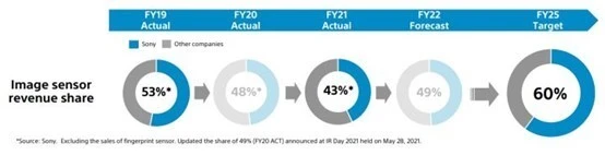 在今年 5 月舉行的索尼投資者關(guān)系日中的“圖像和傳感解決方案(I&SS)”部分,這位來自日本的圖像傳感器巨頭,除了公布了位于長崎的 Fab5 進一步擴建計劃以及包含 JASM 在內(nèi)的投資項目等擴產(chǎn)計劃以外,還強調(diào)了要在 2025 財年將索尼占整個圖像傳感器市場的營收份額從 2021 財年的 43% 擴大到 60%。