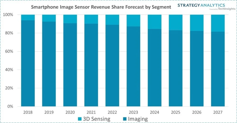 此外,圖像傳感器在非成像領(lǐng)域的應(yīng)用(例如汽車)也是一個機會。實際上,由于智能手機在圖像傳感器需求中的主導(dǎo)地位,對非成像領(lǐng)域圖像傳感器的強勁需求很可能被忽視了!拔艺J為這一趨勢將繼續(xù)增長。我對此很有信心,因為在圖像傳感器的許多應(yīng)用中,圖像本身并不是最終目標”,知名圖像傳感器博客 Image Sensors World 的作者之一 Atul Ingle 在《集微訪談》節(jié)目中接受筆者采訪時表示。實際上,根據(jù) Strategy Analytics 的數(shù)據(jù),即便在手機領(lǐng)域,用于空間傳感的圖像傳感器營收占比也呈現(xiàn)著逐年遞增的趨勢。