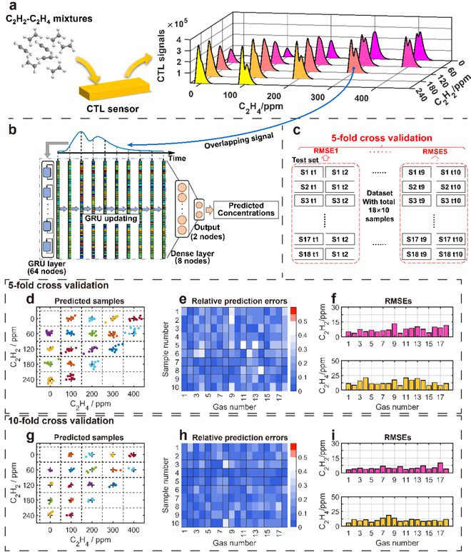 團(tuán)隊(duì)以單個(gè)催化化學(xué)發(fā)光傳感器對(duì)乙烯-乙炔二元?dú)怏w的檢測為例,提出基于GRU(Gated Recurrent Unit)神經(jīng)網(wǎng)絡(luò)的混合物多組分智能檢測方法。該方法通過循環(huán)迭代的方式,能夠提取氣體傳感器的信號(hào)時(shí)序特征。該研究中,針對(duì)18種不同濃度配比的乙烯-乙炔二元?dú)怏w混合物,可直接根據(jù)傳感器響應(yīng)信號(hào)預(yù)測各組樣品的組分含量,在5折交叉驗(yàn)證測試中,成功識(shí)別了這18種二元?dú)怏w樣本,準(zhǔn)確率達(dá)99.9%以上。