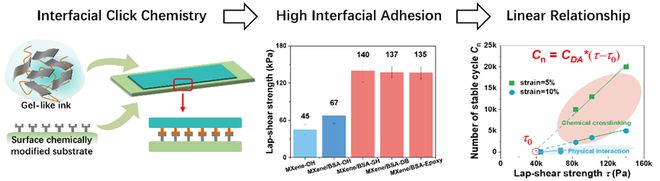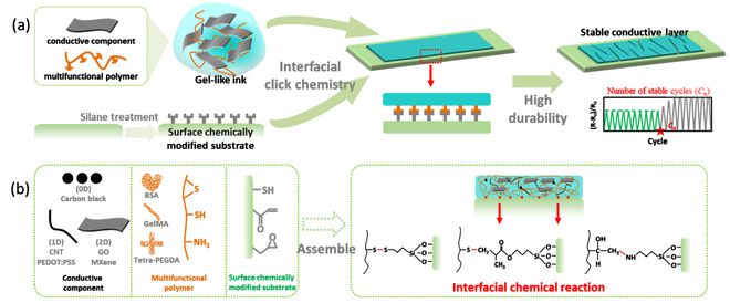 圖2 基于“點擊化學”構建導電層與基底間強界面黏附推動傳感器具有高耐久性。