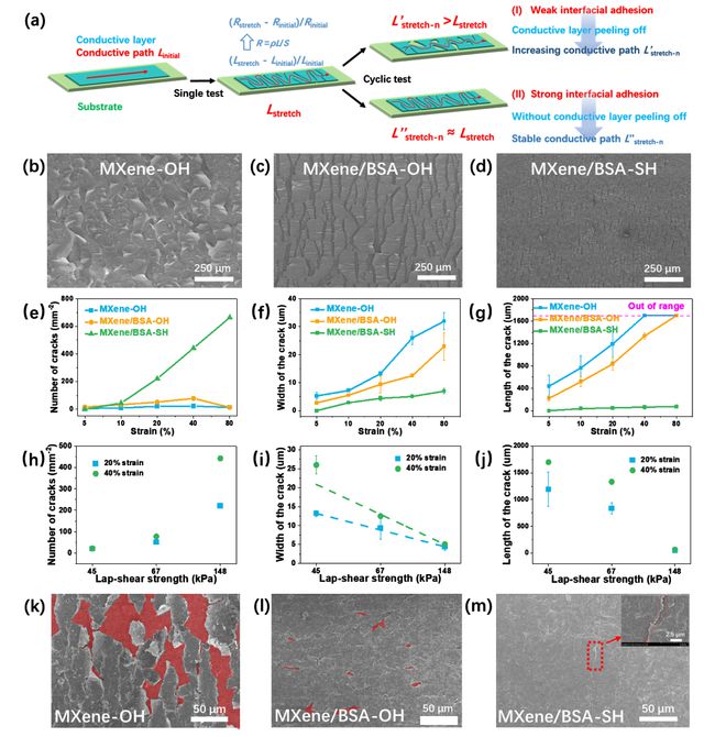 為解釋界面黏附強度影響傳感器耐久性的工作機理,作者針對具有不同界面黏附的傳感器的導電層進行了掃描電鏡表征和分析。圖4表明,隨著界面黏附強度的提升,導電層在固定應變下產生的裂痕大小(長度和寬度)減小,但是數目明顯增多。這種現象是傳感器在保持較高拉伸性的前提下大幅提升拉伸性的原因。在1000次的循環測試之后,具有較弱界面黏附的傳感器產生了明顯的導電層剝落,而強界面黏附展示了穩定的導電層與裂痕維持能力,這是傳感器耐久性提升的根本原因。