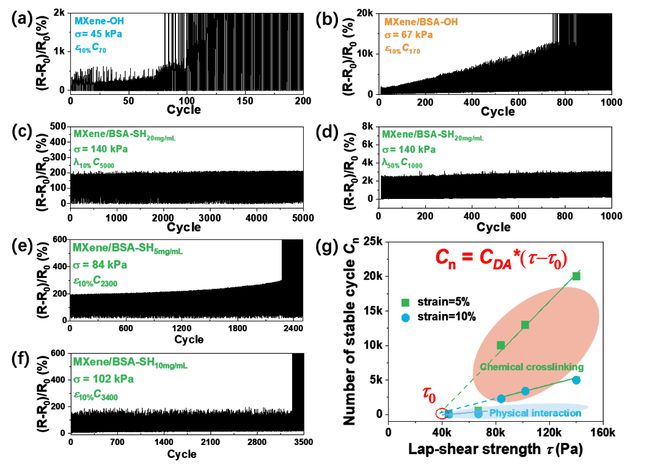 基于“點擊化學”制備的柔性應變傳感器具有可控的界面黏附強度,作者仔細的研究了界面黏附強度與耐久性之間的關系。首先,作者提出了用于表征耐久性的參數:穩定循環次數 C n,該參數表示傳感器在固定應變下能夠穩定輸出電阻信號的次數。通過調控界面交聯密度得到了除界面黏附強度外其他因素皆相同的傳感器,并探索了黏附強度與穩定循環次數之間的關系。如圖3所示,隨著界面黏附強度的增加,穩定循環次數隨之線性增加,并且該線性關系的斜率與應變大小,界面類型等因素都有關,作者推導出二者之間的轉換因子"durability-adhesion coefficient ( CDA)”。